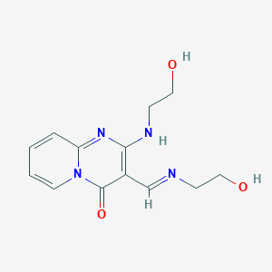 The synthesis of 2-[(2-hydroxyethyl)amino]-3-[(1E)-[(2-hydroxyethyl)imino]methyl]-4H-pyrido[1,2-a]pyrimidin-4-one typically involves multi-step organic reactions. The process begins with the preparation of the pyrido[1,2-a]pyrimidin-4-one core, followed by the introduction of the hydroxyethylamino and hydroxyethylimino groups. Common reagents used in these reactions include aldehydes, amines, and catalysts under controlled temperature and pH conditions.