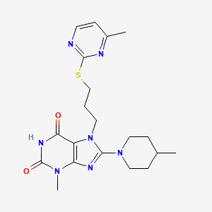 The mechanism of action of 3-Methyl-8-(4-methylpiperidyl)-7-[3-(4-methylpyrimidin-2-ylthio)propyl]-1,3,7-trihydropurine-2,6-dione involves its interaction with specific molecular targets, such as enzymes or receptors. These interactions can modulate various biochemical pathways, leading to the compound’s observed effects. The exact molecular targets and pathways involved depend on the specific application and context of use.