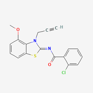 The synthesis of 2-chloro-N-(4-methoxy-3-prop-2-ynyl-1,3-benzothiazol-2-ylidene)benzamide typically involves multi-step organic reactions. One common method involves the condensation of 2-chlorobenzoyl chloride with 4-methoxy-3-prop-2-ynyl-1,3-benzothiazole-2-amine under basic conditions. The reaction is usually carried out in the presence of a base such as triethylamine or pyridine, and the product is purified by recrystallization or chromatography .