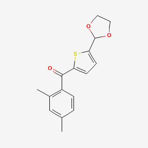 2-(2,4-Dimethylbenzoyl)-5-(1,3-dioxolan-2-yl)thiophene is a thiophene-based organic compound featuring a benzoyl substituent at the 2-position of the thiophene ring and a 1,3-dioxolane ring at the 5-position. The benzoyl group is further substituted with methyl groups at the 2- and 4-positions of the aromatic ring. The compound’s reactivity and stability are influenced by the electron-donating methyl groups on the benzoyl moiety and the electron-rich thiophene-dioxolane system .