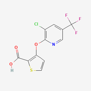 The synthesis of 3-((3-Chloro-5-(trifluoromethyl)pyridin-2-yl)oxy)thiophene-2-carboxylic acid typically involves the reaction of 3-chloro-5-(trifluoromethyl)pyridin-2-ol with thiophene-2-carboxylic acid under specific conditions. The reaction is often carried out in the presence of a base, such as potassium carbonate, and a coupling agent, such as N,N’-dicyclohexylcarbodiimide (DCC), to facilitate the formation of the ester linkage .