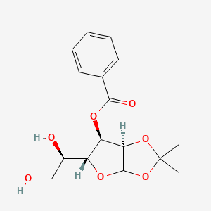 The synthesis of 1,2-O-isopropylidene-3-O-benzoyl-D-allofuranose typically involves sequential protection of hydroxyl groups. The isopropylidene group is introduced first under acidic conditions (e.g., acetone with H₂SO₄/CuSO₄) to protect the 1,2-diol, forming a rigid furanose ring . The 3-OH is then selectively benzoylated using benzoyl chloride or a similar agent in the presence of a base (e.g., pyridine or NaH) to avoid over-substitution. For example, in one protocol, benzoylation is performed after oxidation and reduction steps to ensure regioselectivity . The order of protection is critical to prevent undesired side reactions.