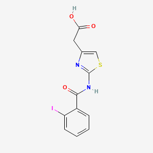 The synthesis of 2-[2-(2-Iodobenzamido)-1,3-thiazol-4-yl]acetic acid typically involves multiple steps, starting with the preparation of the thiazole ring and subsequent attachment of the iodobenzamido group. One common synthetic route involves the reaction of 2-aminothiazole with 2-iodobenzoyl chloride in the presence of a base such as triethylamine to form the intermediate 2-(2-iodobenzamido)-1,3-thiazole. This intermediate is then reacted with chloroacetic acid under basic conditions to yield the final product . Industrial production methods may involve similar steps but are optimized for large-scale synthesis, including the use of continuous flow reactors and automated systems to ensure high yield and purity.