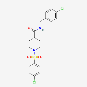 The mechanism by which N-(4-chlorobenzyl)-1-[(4-chlorophenyl)sulfonyl]piperidine-4-carboxamide exerts its effects involves interactions with molecular targets such as enzymes or receptors. The sulfonyl group can form strong interactions with active sites, while the piperidine ring provides structural stability. The chlorinated benzyl and phenyl groups enhance the compound’s binding affinity through hydrophobic interactions.