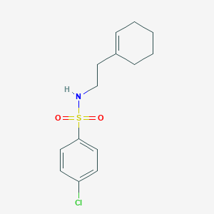 The mechanism of action of 4-chloro-N-[2-(cyclohex-1-en-1-yl)ethyl]benzene-1-sulfonamide involves its interaction with specific molecular targets, such as enzymes or receptors. The sulfonamide group can mimic the structure of natural substrates, allowing the compound to bind to the active site of enzymes and inhibit their activity. This inhibition can disrupt essential biochemical pathways, leading to the desired therapeutic or biological effect.