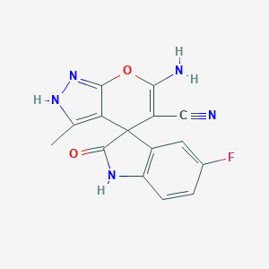 6'-amino-5-fluoro-3'-methyl-2-oxospiro[1H-indole-3,4'-2H-pyrano[2,3-c]pyrazole]-5'-carbonitrile is a useful research compound. Its molecular formula is C15H10FN5O2 and its molecular weight is 311.27g/mol. The purity is usually 95%.