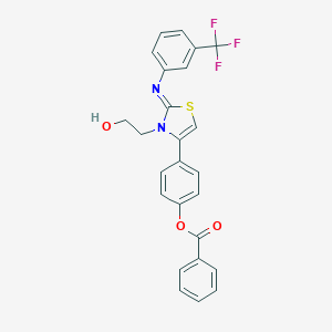4-[(2Z)-3-(2-hydroxyethyl)-2-{[3-(trifluoromethyl)phenyl]imino}-2,3-dihydro-1,3-thiazol-4-yl]phenyl benzoate is unique due to the combination of its functional groups, which confer distinct chemical and biological properties. The trifluoromethyl group enhances its stability and lipophilicity, while the thiazole ring contributes to its potential bioactivity.