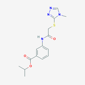 Isopropyl 3-({[(4-methyl-4H-1,2,4-triazol-3-yl)sulfanyl]acetyl}amino)benzoate is a useful research compound. Its molecular formula is C15H18N4O3S and its molecular weight is 334.4g/mol. The purity is usually 95%.
