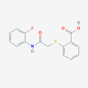 2-({2-[(2-Fluorophenyl)amino]-2-oxoethyl}thio)benzoic acid, also known by its CAS number 385382-63-8, is an organic compound featuring a benzoic acid moiety linked to a fluorophenyl group through a thioether and amide linkage. This compound has garnered interest in various fields, particularly in medicinal chemistry, due to its potential biological activities.