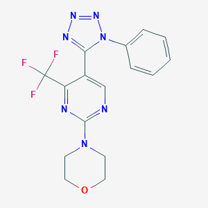 4-[5-(1-phenyl-1H-tetraazol-5-yl)-4-(trifluoromethyl)-2-pyrimidinyl]morpholine is a useful research compound. Its molecular formula is C16H14F3N7O and its molecular weight is 377.32g/mol. The purity is usually 95%.