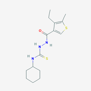 N-cyclohexyl-2-[(4-ethyl-5-methylthiophen-3-yl)carbonyl]hydrazinecarbothioamide is a complex organic compound characterized by its unique structure, which includes a cyclohexyl group, a thienyl ring, and a hydrazinecarbothioamide moiety