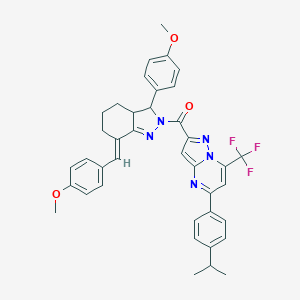 [5-(4-ISOPROPYLPHENYL)-7-(TRIFLUOROMETHYL)PYRAZOLO[1,5-A]PYRIMIDIN-2-YL]{3-(4-METHOXYPHENYL)-7-[(E)-1-(4-METHOXYPHENYL)METHYLIDENE]-3,3A,4,5,6,7-HEXAHYDRO-2H-INDAZOL-2-YL}METHANONE has several scientific research applications: