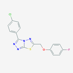 The synthesis of 3-(4-Chlorophenyl)-6-[(4-fluorophenoxy)methyl]-[1,2,4]triazolo[3,4-b][1,3,4]thiadiazole typically involves multiple steps, starting from readily available precursors. One common approach includes the cyclization of appropriate hydrazides with thiocarbonyl compounds, followed by the introduction of the chlorophenyl and fluorophenoxy groups through nucleophilic substitution reactions. The reaction conditions often require the use of catalysts, such as triethylamine or potassium carbonate, and solvents like dimethylformamide (DMF) or acetonitrile.