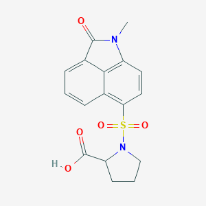 1-[(1-Methyl-2-oxo-1,2-dihydrobenzo[cd]indol-6-yl)sulfonyl]proline, a sulfonamide derivative, has garnered interest in medicinal chemistry due to its potential biological activities. This compound is characterized by its unique structure, which includes a benzo[cd]indole moiety and a proline backbone, suggesting possible interactions with various biological targets.
