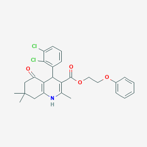 The synthesis of 2-phenoxyethyl 4-(2,3-dichlorophenyl)-2,7,7-trimethyl-5-oxo-1,4,5,6,7,8-hexahydroquinoline-3-carboxylate typically involves multiple steps, including substitution, acylation, cyclization, and acidification reactions. The process begins with the preparation of the phenoxyethyl and dichlorophenyl intermediates, which are then subjected to cyclization to form the hexahydroquinoline core. The final step involves the esterification of the carboxylate group .
