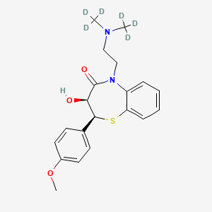 The benzothiazepine core structure remains intact throughout the metabolic transformation and isotopic labeling process. This seven-membered ring system fused to a benzene ring provides the fundamental pharmacophore responsible for calcium channel blocking activity. The 4-methoxyphenyl substituent at the 2-position and the dimethylaminoethyl chain at the 5-position are conserved structural elements that contribute to the compound's biological activity and analytical detectability. The hydroxyl group at the 3-position, which becomes exposed following deacetylation, creates a more polar metabolite compared to the parent drug, influencing both pharmacokinetic properties and analytical separation characteristics.