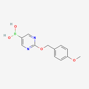 The compound’s structure combines a pyrimidine scaffold with a boronic acid moiety, enabling participation in Suzuki-Miyaura cross-coupling reactions. The 4-methoxybenzyloxy group enhances solubility and stabilizes the boronic acid against hydrolysis.