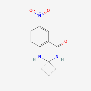The synthesis of 6-Nitrospiro[1,2,3,4-tetrahydroquinazoline-2,1’-cyclobutane]-4-one typically involves multi-step organic reactions. One common synthetic route starts with the preparation of a suitable quinazoline derivative, followed by the introduction of a nitro group and the formation of the spiro linkage. The reaction conditions often require the use of strong acids or bases, high temperatures, and specific catalysts to facilitate the formation of the spiro structure.
