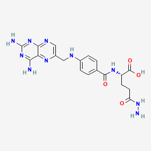 Aminopterin-α-hydrazide is a synthetic derivative of aminopterin, a folate antagonist with structural modifications at the α-position. Its systematic IUPAC name is derived by appending the hydrazide functional group to the core aminopterin structure.