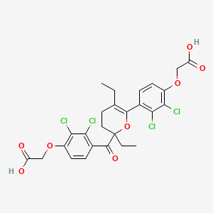 The International Union of Pure and Applied Chemistry systematic nomenclature for this compound is established as 2-[4-[2-[4-(carboxymethoxy)-2,3-dichlorobenzoyl]-2,5-diethyl-3,4-dihydropyran-6-yl]-2,3-dichlorophenoxy]acetic acid. This complex nomenclature reflects the intricate structural arrangement featuring two dichlorobenzoyl moieties connected through a central diethyl-dihydropyran ring system. The systematic name precisely describes the positioning of each functional group, including the carboxymethoxy substituents and the phenoxyacetic acid termini.