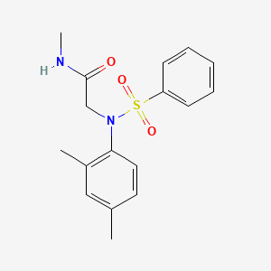 The synthesis of 2-[N-(benzenesulfonyl)-2,4-dimethylanilino]-N-methylacetamide typically involves the reaction of benzenesulfonyl chloride with 2,4-dimethylaniline in the presence of a base such as triethylamine. The resulting intermediate is then reacted with N-methylacetamide under controlled conditions to yield the final product. The reaction is usually carried out in an organic solvent like dichloromethane or acetonitrile, and the temperature is maintained at around 0-5°C to ensure the stability of the intermediates.