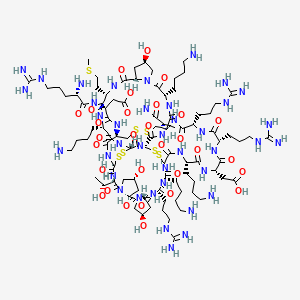 InChI=1S/C101H175N39O30S7/c1-48(76(107)149)120-87(160)64-42-172-173-43-65-88(161)125-54(17-4-8-25-102)80(153)130-63(38-74(147)148)85(158)124-57(21-13-30-117-99(110)111)78(151)123-58(22-14-31-118-100(112)113)83(156)132-66-44-174-176-46-68(134-86(159)62(37-73(145)146)129-77(150)53(106)16-12-29-116-98(108)109)91(164)136-69(47-177-175-45-67(90(163)135-64)133-82(155)56(19-6-10-27-104)122-84(157)60(24-33-171-3)127-93(166)70-34-50(142)39-138(70)95(168)61(128-89(66)162)20-7-11-28-105)92(165)137-75(49(2)141)97(170)140-41-52(144)36-72(140)96(169)139-40-51(143)35-71(139)94(167)126-59(23-15-32-119-101(114)115)79(152)121-55(81(154)131-65)18-5-9-26-103/h48-72,75,141-144H,4-47,102-106H2,1-3H3,(H2,107,149)(H,120,160)(H,121,152)(H,122,157)(H,123,151)(H,124,158)(H,125,161)(H,126,167)(H,127,166)(H,128,162)(H,129,150)(H,130,153)(H,131,154)(H,132,156)(H,133,155)(H,134,159)(H,135,163)(H,136,164)(H,137,165)(H,145,146)(H,147,148)(H4,108,109,116)(H4,110,111,117)(H4,112,113,118)(H4,114,115,119)/t48-,49+,50+,51+,52+,53-,54-,55-,56-,57-,58-,59-,60-,61-,62-,63-,64-,65-,66-,67-,68-,69-,70-,71-,72-,75-/m0/s1 | |
