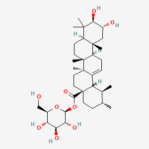 “(2alpha,3beta)-2,3-Dihydroxy-urs-12-en-28-oic acid beta-D-glucopyranosyl ester” is a triterpenoid saponin derived from the ursane skeleton, a pentacyclic structure common in plant-derived bioactive compounds. Its core structure, urs-12-en-28-oic acid, features hydroxyl groups at the 2α and 3β positions and a β-D-glucopyranosyl ester moiety at the carboxyl group (C-28) . The molecular formula is C₃₆H₅₈O₉, with a molecular weight of 650.85 g/mol. This compound is characterized by its amphiphilic nature, combining a hydrophobic triterpene aglycone with a hydrophilic sugar unit, which enhances solubility and bioactivity .