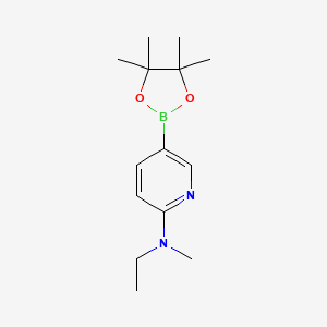 The mechanism of action of N-ethyl-N-methyl-5-(4,4,5,5-tetramethyl-1,3,2-dioxaborolan-2-yl)pyridin-2-amine largely depends on its application. In Suzuki-Miyaura cross-coupling, the boronic ester group forms a complex with the palladium catalyst, facilitating the transfer of the aryl or vinyl group to the halide substrate. In medicinal chemistry, the compound may interact with specific molecular targets, such as enzymes or receptors, through hydrogen bonding, hydrophobic interactions, or covalent bonding, modulating their activity and leading to the desired therapeutic effect.