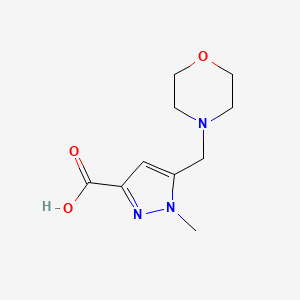 The molecular structure of 1H-pyrazole-3-carboxylic acid, 1-methyl-5-(4-morpholinylmethyl)- (CAS: 1198439-06-3) is defined by the formula C₁₀H₁₅N₃O₃ , with a molecular weight of 225.24 g/mol . The compound features a pyrazole ring substituted at position 1 with a methyl group, at position 3 with a carboxylic acid group, and at position 5 with a 4-morpholinylmethyl moiety (Figure 1).
