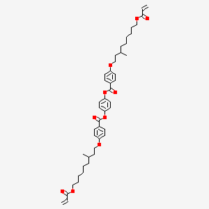 The molecular design follows established principles for reactive mesogen synthesis. The central rigid core provides the necessary anisotropic properties for liquid crystalline behavior, while the flexible spacer chains allow for molecular packing and phase formation. The terminal reactive groups enable controlled polymerization without disrupting the mesomorphic properties during the initial stages of network formation. This careful balance of structural elements places the compound within the most versatile category of reactive mesogens suitable for advanced materials applications.