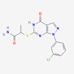 While specific biological data for 2-((1-(3-Chlorophenyl)-4-oxo-4,5-dihydro-1H-pyrazolo[3,4-d]pyrimidin-6-yl)thio)propanamide is not extensively documented, the pyrazolo[3,4-d]pyrimidine scaffold is a well-established pharmacophore in many kinase inhibitors. Structurally related compounds have shown inhibitory activity against a range of kinases, suggesting potential therapeutic applications in oncology and inflammatory diseases.
