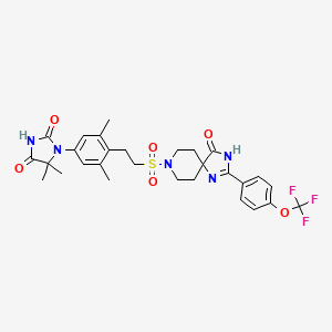 IUPAC Name: 1-(3,5-dimethyl-4-(2-((4-oxo-2-(4-(trifluoromethoxy)phenyl)-1,3,8-triazaspiro[4.5]dec-1-en-8-yl)sulfonyl)ethyl)phenyl)-5,5-dimethylimidazolidine-2,4-dione[5]