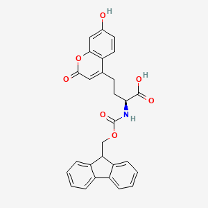 The mechanism by which (S)-2-((((9H-Fluoren-9-YL)methoxy)carbonyl)amino)-4-(7-hydroxy-2-oxo-2H-chromen-4-YL)butanoic acid exerts its effects is likely related to its ability to interact with specific molecular targets. The fluorenyl and chromenyl groups can engage in π-π stacking interactions, while the amino and hydroxyl groups can form hydrogen bonds with target proteins or enzymes. These interactions can modulate the activity of the target molecules, leading to the observed biological effects.