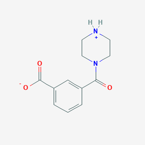3-(Piperazin-4-ium-1-carbonyl)benzoate is a zwitterionic compound comprising a benzoate anion linked via a carbonyl group to a piperazin-4-ium cation. The piperazinium moiety contributes cationic character, enhancing solubility in polar solvents, while the benzoate group provides an anionic center, facilitating ionic interactions. This structural duality makes it a candidate for pharmaceutical applications, particularly in drug delivery systems where solubility and bioavailability are critical.