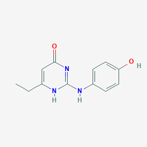 The synthesis of 6-ethyl-2-(4-hydroxyanilino)-1H-pyrimidin-4-one involves several steps, each requiring specific reaction conditions and reagents. The preparation method typically includes the use of high-purity starting materials and controlled reaction environments to ensure the desired product’s purity and yield. Detailed synthetic routes and reaction conditions are often proprietary and may vary depending on the intended application and scale of production.