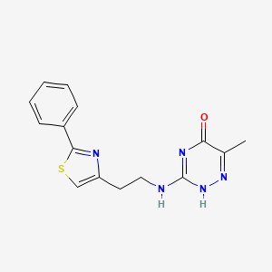 The synthetic routes and reaction conditions for the preparation of 6-methyl-3-[2-(2-phenyl-1,3-thiazol-4-yl)ethylamino]-2H-1,2,4-triazin-5-one are not explicitly detailed in the available literature. general methods for synthesizing complex organic compounds often involve multi-step processes that include the formation of carbon-carbon bonds, functional group transformations, and purification steps. Industrial production methods typically scale up these processes using optimized conditions to ensure high yield and purity.