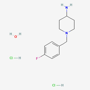 1-(4-Fluorobenzyl)-4-piperidinamine dihydrochloride hydrate (CAS: MFCD18483402) is a fluorinated piperidine derivative with the molecular formula C₁₂H₁₇FN₂·2HCl·H₂O and a molecular weight of 299.20 g/mol . This compound features a 4-fluorobenzyl substituent attached to the piperidine ring at the 1-position, with a primary amine group at the 4-position. It is supplied as a dihydrochloride hydrate salt, ensuring enhanced solubility and stability for research applications. The purity of the commercially available product is typically 95%, making it suitable for pharmaceutical and biochemical studies .