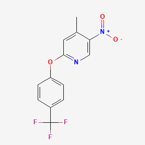 4-Methyl-5-nitro-2-(4-(trifluoromethyl)phenoxy)pyridine is a heterocyclic compound featuring a pyridine core substituted with a methyl group at position 4, a nitro group at position 5, and a 4-(trifluoromethyl)phenoxy moiety at position 2. This structure combines electron-withdrawing (nitro, trifluoromethyl) and electron-donating (methyl) groups, influencing its electronic properties and reactivity. The trifluoromethylphenoxy group enhances lipophilicity and metabolic stability, making it relevant in agrochemical and pharmaceutical research .
