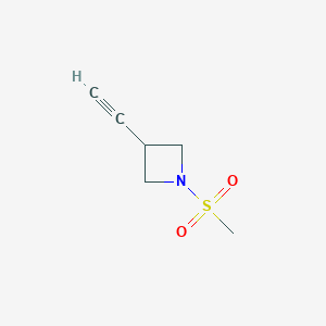 The mechanism of action of 3-Ethynyl-1-methanesulfonylazetidine involves its interaction with specific molecular targets and pathways. The ethynyl group can participate in various chemical reactions, leading to the formation of reactive intermediates that interact with biological molecules. The methanesulfonyl group can enhance the compound’s solubility and reactivity, facilitating its interaction with target proteins and enzymes .