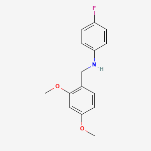 N-(2,4-Dimethoxybenzyl)-4-fluoroaniline is an aromatic amine derivative characterized by a 4-fluoroaniline backbone substituted with a 2,4-dimethoxybenzyl group at the nitrogen atom. This compound belongs to a class of N-alkyl/aryl anilines, which are widely explored in medicinal and materials chemistry due to their tunable electronic and steric properties. The 2,4-dimethoxybenzyl moiety introduces strong electron-donating effects, enhancing solubility in polar solvents, while the 4-fluoro substituent on the aniline ring contributes to its reactivity in electrophilic substitution reactions .