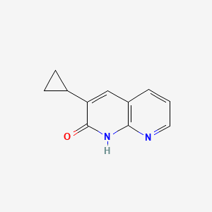 3-Cyclopropyl-[1,8]naphthyridin-2-ol is a heterocyclic compound belonging to the 1,8-naphthyridine family, characterized by a bicyclic structure with nitrogen atoms at positions 1 and 6. This compound is synthesized via multi-step reactions involving cyclopropane introduction, as inferred from methodologies in related 1,8-naphthyridine derivatives . Its structural features suggest applications in medicinal chemistry, particularly in targeting enzymes or receptors influenced by planar heterocycles and lipophilic substituents.