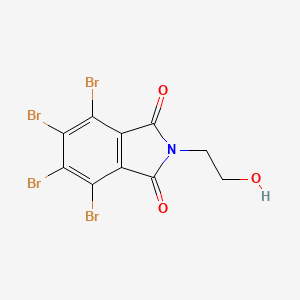 - Methodology : The synthesis typically involves reacting tetrabromophthalic anhydride with 2-hydroxyethylamine to form an amic acid intermediate, followed by cyclization via thermal dehydration or acid catalysis to yield the imide. Characterization of intermediates and final products requires Fourier-transform infrared spectroscopy (FTIR) to confirm imide ring formation (C=O stretching at ~1700 cm⁻¹) and nuclear magnetic resonance (NMR) spectroscopy (¹H/¹³C) to verify substitution patterns. Elemental analysis and mass spectrometry (MS) further validate purity .