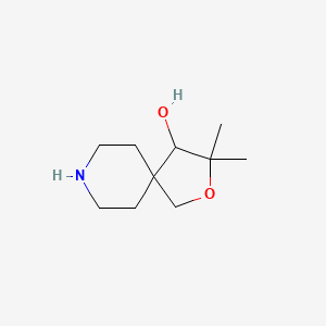 3,3-dimethyl-2-Oxa-8-azaspiro[4.5]decan-4-ol is a spiro compound characterized by its unique bicyclic structure, which includes an oxygen and nitrogen atom within the rings. Spiro compounds are known for their three-dimensional structural properties and inherent rigidity, making them valuable in various scientific and industrial applications .