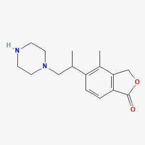 4-methyl-5-(1-piperazin-1-ylpropan-2-yl)-3H-2-benzofuran-1-one is a synthetic organic compound belonging to the benzofuran family. This compound is characterized by its unique structure, which includes a benzofuran core substituted with a piperazine moiety. It has garnered interest in various fields of scientific research due to its potential biological and pharmacological activities.