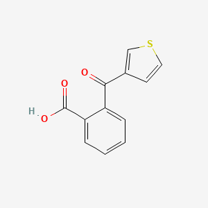2-(Thiophene-3-carbonyl)benzoic acid is a heterocyclic carboxylic acid derivative featuring a benzoic acid backbone substituted with a thiophene-3-carbonyl group. The compound’s molecular formula is C₁₂H₈O₃S, with a molecular weight of 232.25 g/mol. The thiophene ring, a five-membered aromatic system containing sulfur, confers unique electronic and steric properties to the molecule. This structure makes it a versatile intermediate in pharmaceutical and materials chemistry, particularly in the synthesis of bioactive molecules and polymers .
