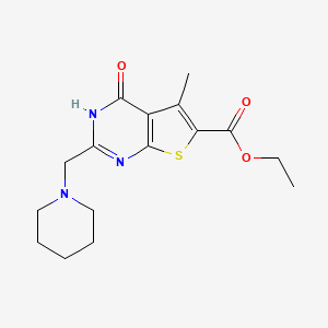 Ethyl 5-methyl-4-oxo-2-piperidinomethyl-3,4-dihydrothieno[2,3-d]pyrimidine-6-carboxylate is a thienopyrimidine derivative characterized by a bicyclic thieno[2,3-d]pyrimidine core. Key structural features include a 5-methyl group, a 4-oxo moiety, an ethyl carboxylate at position 6, and a piperidinomethyl substituent at position 2 . This compound is of interest due to its structural similarity to pharmacologically active thienopyrimidines, which often exhibit antimicrobial, anticancer, or enzyme-inhibitory properties . Its synthesis typically involves condensation reactions under reflux conditions, followed by purification via recrystallization or column chromatography .