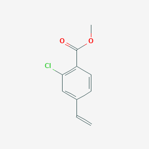 Methyl 2-chloro-4-vinylbenzoate (C₁₀H₉ClO₂) is a substituted benzoate ester characterized by a chlorine atom at the ortho position and a vinyl group at the para position on the aromatic ring. This compound is primarily utilized in synthetic organic chemistry as an intermediate for pharmaceuticals, agrochemicals, and polymer precursors. Its reactivity is influenced by the electron-withdrawing chlorine substituent and the electron-rich vinyl group, enabling participation in cross-coupling reactions and polymerization processes . Notably, commercial availability of this compound has been discontinued, as indicated by supplier listings from CymitQuimica, suggesting challenges in synthesis, stability, or market demand .