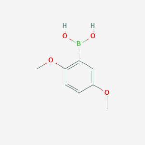 The mechanism of action of 2,5-Dimethoxyphenylboronic acid primarily involves its role as a reactant in various coupling reactions. In Suzuki-Miyaura coupling, the boronic acid group interacts with a palladium catalyst to form a palladium-boron complex. This complex then undergoes transmetalation with an aryl or vinyl halide, followed by reductive elimination to form the desired carbon-carbon bond .