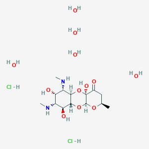 Spectinomycin dihydrochloride pentahydrate (C${14}$H${24}$N$2$O$7$·2HCl·5H$_2$O; molecular weight: 495.35 g/mol) is an aminocyclitol antibiotic derived from Streptomyces spectabilis . It inhibits bacterial protein synthesis by reversibly binding to the 16S rRNA of the 30S ribosomal subunit, disrupting translocation during mRNA decoding . This bacteriostatic activity makes it effective against a broad spectrum of Gram-positive and Gram-negative bacteria, including Staphylococcus aureus, Escherichia coli, Salmonella spp., and mycoplasma .