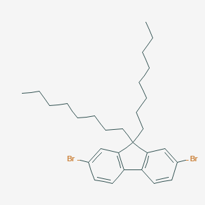 This compound is a fluorene (B118485) derivative that serves as a crucial building block in the synthesis of advanced organic electronic materials.[1] Its molecular structure is distinguished by a fluorene core, which provides rigidity and desirable electronic properties. The two bromine atoms at the 2 and 7 positions act as reactive sites for polymerization, typically through palladium-catalyzed cross-coupling reactions like Suzuki or Stille coupling.[1][2] Furthermore, the two long n-octyl chains at the 9-position are critical for enhancing the material's solubility in common organic solvents, which is essential for solution-based processing of organic electronic devices.[1] This improved processability allows for the formation of uniform thin films required for devices such as organic light-emitting diodes (OLEDs), organic photovoltaics (OPVs), and organic field-effect transistors (OFETs).[3][4] This document provides a comprehensive overview of the core , along with relevant experimental protocols and reaction pathways.